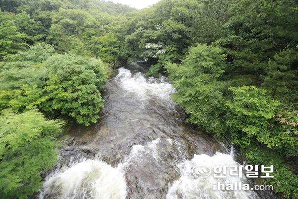 폭우가 쏟아진 11일 오전 제주 한라산 국립공원 성판교 계곡에 급류가 흐르고 있다. 연합뉴스