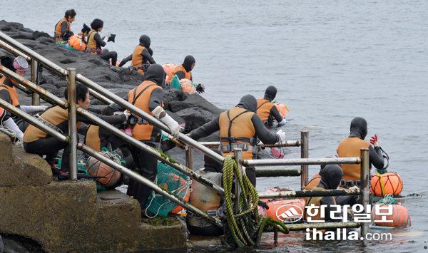 13일 제주시 이호동 바닷가에서 해녀들이 물질 작업을 나서기 위해 준비하고 있다. 강희만기자