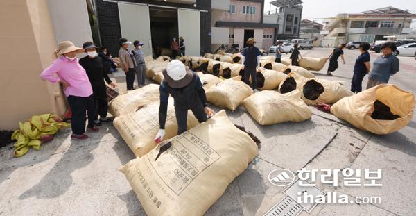 14일 제주시 도두어촌계에서 수협 직원들이 해녀들이 수확한 우뭇가사리 품질검사를 진행하고 있다. 이상국기자