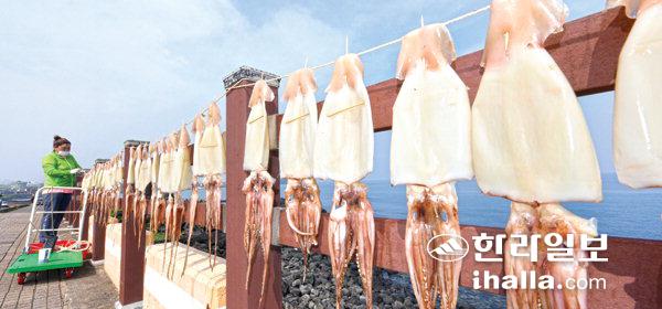 14일 제주시 용담해안도로에서 한 상인이 6월 햇살 아래 오징어 말리기 작업을 하고 있다. 이상국기자