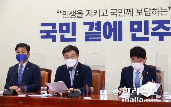 더불어민주당 윤호중 원내대표(가운데)가 15일 서울 여의도 국회에서 열린 원내대책회의에서 발언하고 있다. 연합뉴스