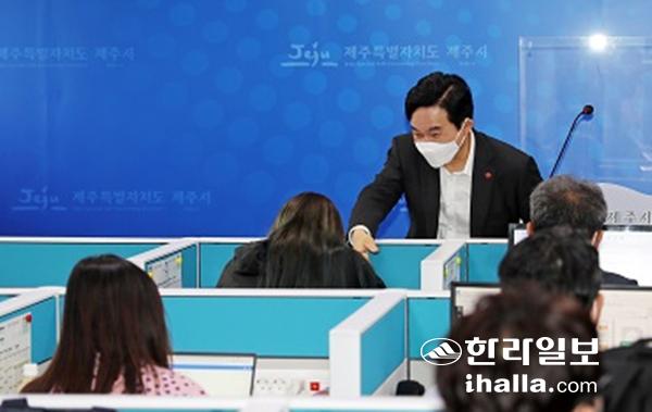 16일 제주시청 기자실을 찾은 원희룡 제주도지사가 기자들과 악수를 나누고 있다. 사진=제주시