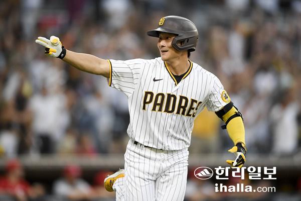 샌디에이고 파드리스 김하성이 20일(한국시간) 미국 캘리포니아주 샌디에이고 펫코 파크에서 열린 미국프로야구 메이저리그(MLB) 신시내티 레즈와 홈 경기에서 5-5로 맞선 8회말 좌월 결승 투런 홈런을 날린 뒤 기뻐하고 있다. 연합뉴스