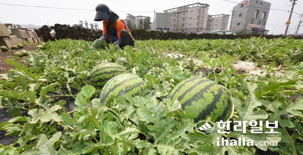 20일 제주시 애월읍 한 수박밭에서 농민이 곧 수확할 예정인 수박을 살펴보고 있다. 이상국기자