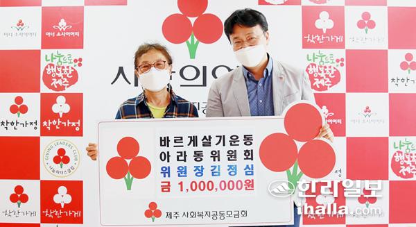 김정심 바르게살기운동 아라동위원회 위원장은 지난 18일 제주사회복지공동모금회(회장 김남식) 사무실을 방문해 이웃사랑 성금 100만원을 기탁했다.
