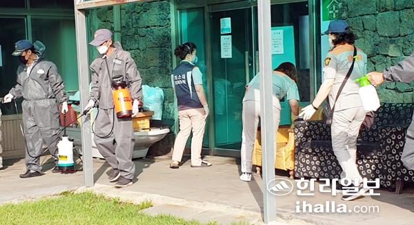 제주동부소방서 표선119센터 성읍의용소방대(대장 고용석·여미경)는 지난 19일 서귀포시 표선면 성읍리·가시리 일대 공공시설물 및 방역취약 시설을 대상으로 코로나19 예방을 위한 일제 방역활동을 실시했다.