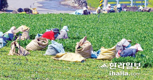 21일 무더운 날씨속에 제주시 애월읍 한 농경지에서 농민들이 취나물 수확 작업을 하고 있다. 강희만기자