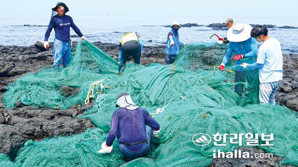21일 제주시 한림읍 수원리 해안가에서 제주바다환경지킴이들이 바다에서 떠밀려 온 폐그물 수거 작업을 하고 있다. 강희만기자