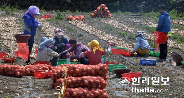 22일 제주시 구좌읍 김녕리 한 밭에서 농민들이 양파를 수확하고 있다. 강희만기자