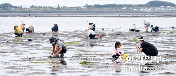 무더위가 계속된 23일 서귀포시 성산읍 오조리 해변을 찾은 가족단위 체험객들이 조개를 캐며 즐거운 시간을 보내고 있다. 이상국기자