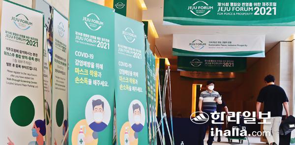 제16회 2021 제주포럼을 하루 앞둔 23일 행사 관계자들이 해비치호텔에서 행사준비로 분주하게 움직이고 있다. 2021 제주포럼은 26일까지 열린다. 이상국기자