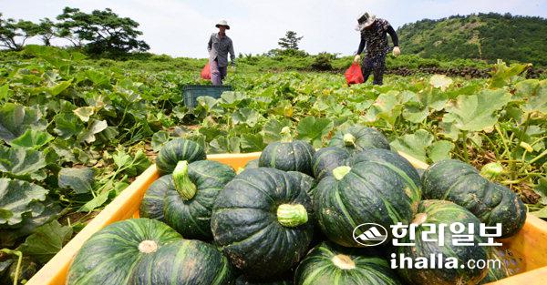 24일 제주시 한경면 용수리 라파라다 농장에서 농민들이 구슬땀을 흘리며 밤호박을 수확하고 있다. 이상국기자
