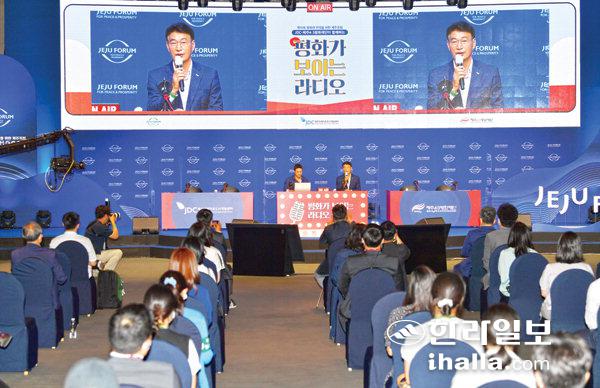 24일 서귀포시 표선읍 해비치호텔 앤드 리조트에서 열린 '제16회 평화와 번영을 위한 제주포럼' 청년세션2에서 문대림 JDC 이사장이 인사말을 하고 있다. 강희만기자