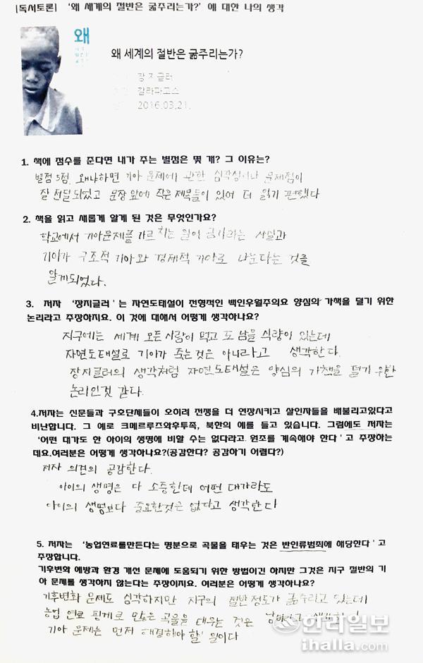'왜 세계의 절반은 굶주리는가?' 책에서는 기아 문제에 있어서 다른 사람의 아픔을 내 아픔으로 느낄 줄 아는 유일한 생명체인 인간의 의식변화에 희망이 있다고 말하고 있다. 이 수업을 통해 우리 사회가 기아에 대한 의식과 관심을 새롭게 하는 계기가 되면 좋겠다.