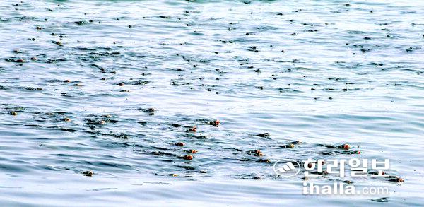 27일 제주시 한경면 금등리 바닷가에서 숭어떼가 물 위 먹이를 먹기 위해 물 밖으로 입을 내밀고 있다. 강희만기자