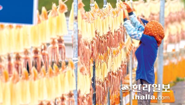 맑은 날씨를 보인 27일 제주시 한경면 고산포구에서 한 어민이 오징어말리기 작업을 하고 있다. 강희만기자