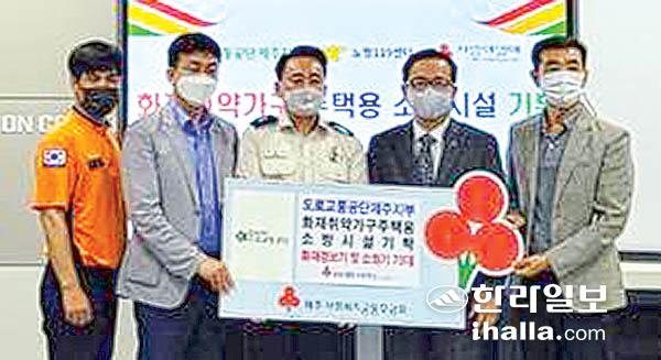 도로교통공단 제주지부(지역본부장 이상철)와 노형119센터(센터장 정경만)는 28일 도로교통공단 본관에서 주택용 소방시설(소화기 및 단독경보형 감지기 각각 35대) 기증 행사를 개최했다.