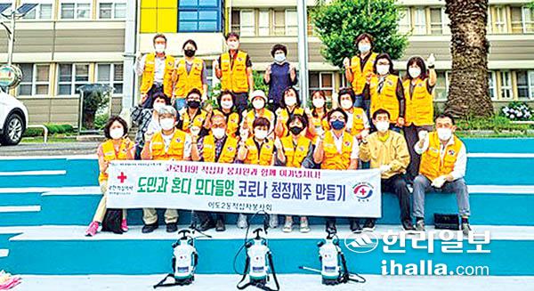 제주시 이도2동적십자봉사회(회장 강철호)는 지난 24일 코로나19 예방을 위해 관내 남광초등학교와 중앙여자고등학교 운동장 내 놀이시설 및 운동 기구에 방역봉사활동을 실시했다.