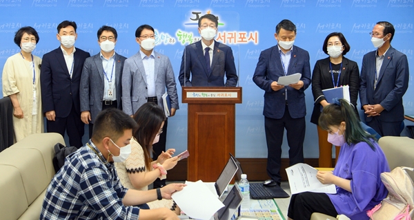 김태엽 서귀포시장이 취임 1주년을 맞아 29일 서귀포시청 기자실에서 기자회견을 갖고 포스트 코로나 시대에 적극 대응하겠다는 입장을 밝히고 있다.