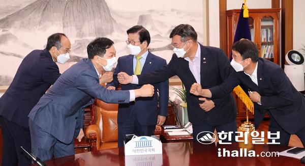 28일 오전 국회에서 열린 국회의장 주재 여야 원내대표 회동에서 국민의힘 추경호 원내수석부대표(왼쪽부터), 김기현 원내대표, 박병석 국회의장, 더불어민주당 윤호중 원내대표, 한병도 원내수석부대표가 인사하고 있다. 연합뉴스