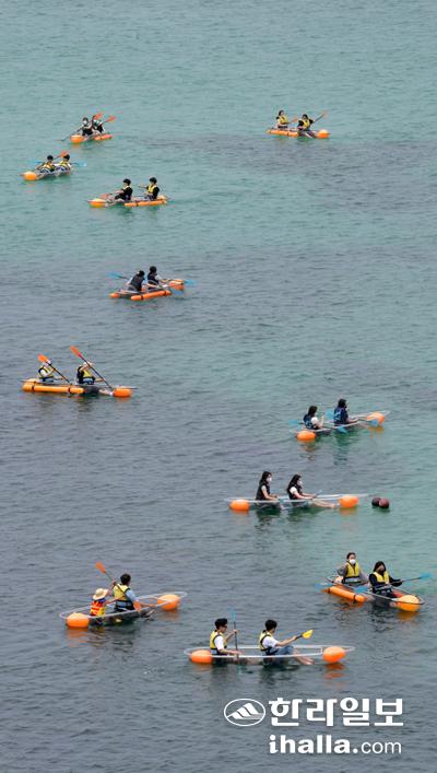 30일 제주시 애월읍 한담 해변을 찾은 관광객들이 투명카약을 타고 제주의 맑고 푸른 바다를 누비며 즐거운 시간을 보내고 있다. 강희만기자