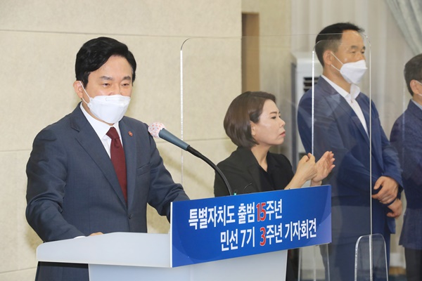 원희룡 제주지사가 1일 오전 제주도청에서 특별자치도 출범 15년, 민선 7기 3주년 기자회견을 하고 있다. 강희만 기자