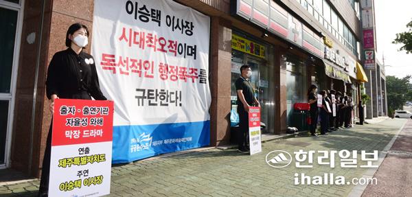 제주문화예술재단 노조원들이 1일 오전 제주시 동광로에 있는 재단 건물 앞에서 이사장의 공무원 파견 요청을 규탄하는 시위를 벌이고 있다. 이상국기자