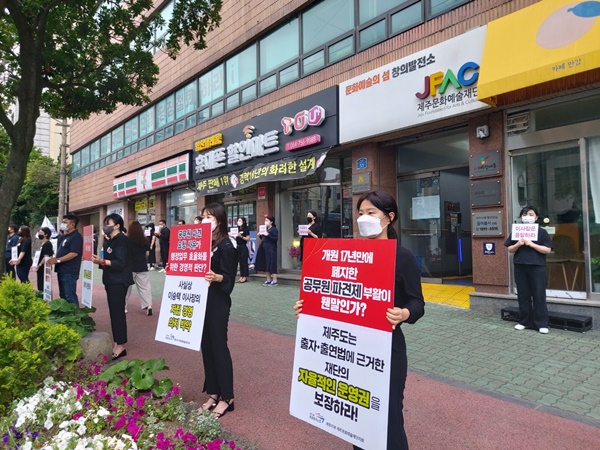 제주문화예술재단 노조가 지난 2일 재단의 공무원 파견 요청과 제주도의 공무원 파견 결정을 규탄하는 출근 전 시위를 벌이고 있다. 사진=노조 제공