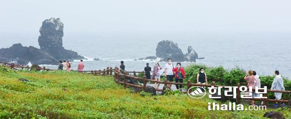장맛비 시작된 3일 비가 간헐적으로 내리는 가운데 서귀포시 성산읍 섭지코지를 찾은 관광객들이 우의를 입고 해안가를 산책하고 있다. 이상국기자