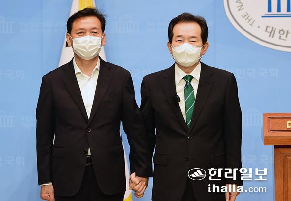 더불어민주당 대선 경선 후보인 정세균 전 국무총리와 이광재 의원이 5일 국회 소통관에서 정세균 전 총리로 후보 단일화에 합의한 뒤 포즈를 취하고 있다. 연합뉴스