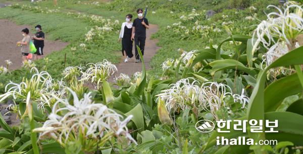 10일 서귀포시 성산읍 광치기 해안가에 문주란꽃이 활짝 피어나 이곳을 찾은 관광객들에게 제주의 이색적인 풍경을 선물하고 있다. 문주란은 수선화과에 속하는 상록의 다년생 초본식물이다. 강희만기자