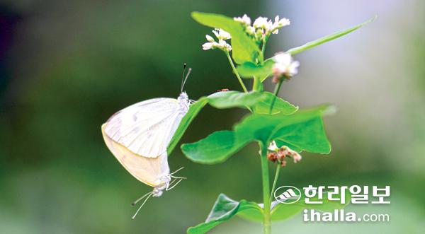 5일 서귀포시 성산읍 제주자연생태공원에서 배추흰나비 한쌍이 짝짓기를 하고 있다. 강희만기자