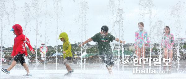 5일 제주시 애월읍 곽지해수욕장 분수대에서 어린이들이 물놀이를 하며 더위를 식히고 있다. 이상국기자