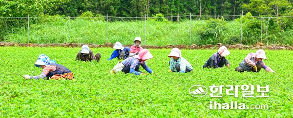 6일 제주시 구좌읍 송당리 한 더덕밭에서 농민들이 잡초를 매고 있다. 이상국기자