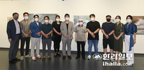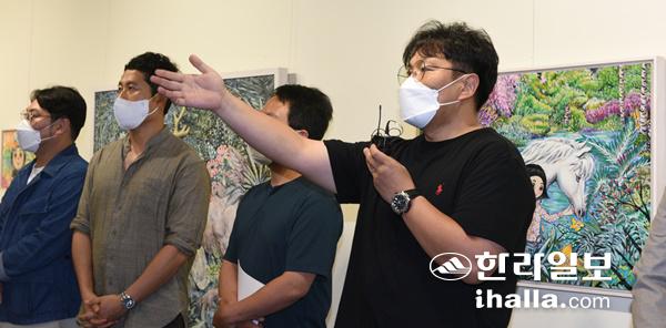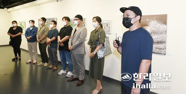 7일 갤러리 이디 개막 행사에 참석한 작가들이 인사말을 하고 있다. 오른쪽부터 최창훈, 김영란, 김산, 고윤식, 김강훈, 조기섭, 신승훈, 양민희 작가. 이상국기자