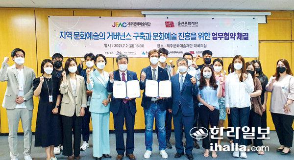 제주문화예술재단(이사장 이승택)은 지난 2일 재단 대회의실에서 울산문화재단(대표이사 전수일)과 '지역 문화예술의 거버넌스 구축과 문화예술 진흥을 위한 업무 협약'을 체결했다.