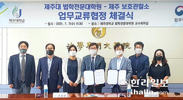 법무부 제주보호관찰소(소장 김기환)와 제주대학교 법학전문대학원(원장 고봉진)은 7일 제주대학교 법학전문대학원 회의실에서 범죄 없는 안전한 지역사회 조성과 보호관찰 대상자의 건전한 사회복귀를 도모하기 위한 업무협약을 체결했다.