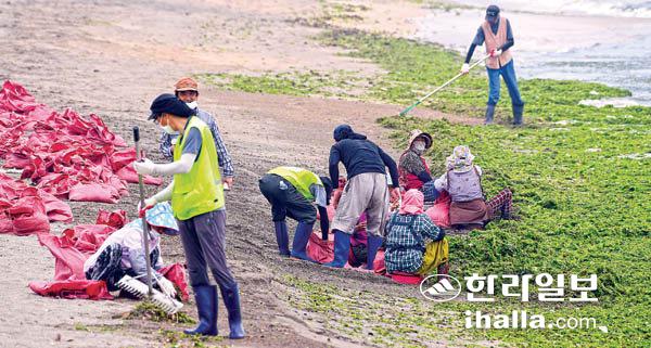 8일 제주시 이호테우해수욕장에서 바다환경지킴이 회원들이 파래 수거작업으로 구슬땀을 흘리고 있다. 강희만기자