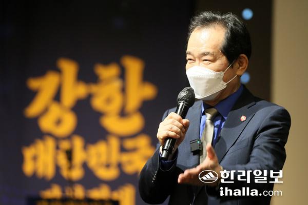 더불어민주당 대선 경선 후보인 정세균 전 국무총리가 10일 제주퍼시픽호텔에서 열린 자신의 지지모임인 '균형사다리' 제주본부 발대식에 참석해 지지자들에게 인사하고 있다. 연합뉴스