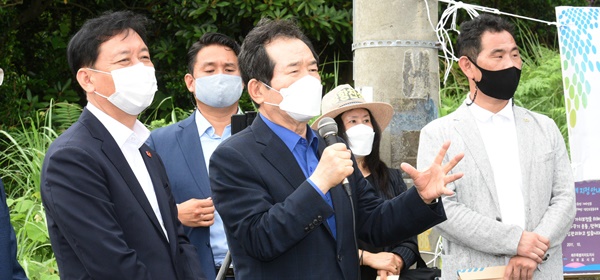 정세균 전 총리는 10일 오전 서귀포시 성산읍 제2공항 건설사업 예정부지를 시찰하며 지역 주민과의 간담회를 갖고 주민들의 목소리를 청취했다. 이상국기자
