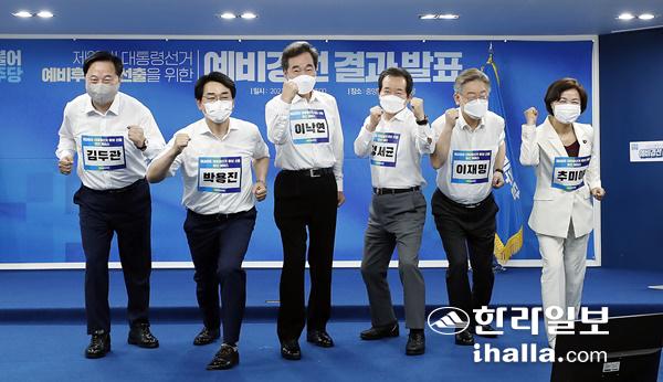 11일 오후 더불어민주당 제20대 대통령선거 예비경선 개표식에서 경선 후보로 선출된 추미애(오른쪽부터), 이재명, 정세균, 이낙연, 박용진, 김두관 후보가 가슴에 이름표를 달고 기념촬영을 하고 있다. 연합뉴스