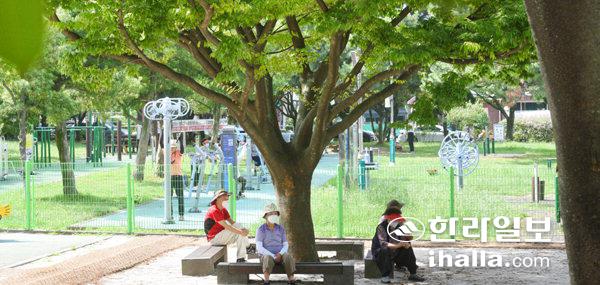 폭염경보가 발효된 12일 제주시 종합경기장 공원을 찾은 어르신들이 나무 그늘에서 휴식을 취하고 있다. 이상국기자