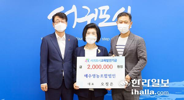 예수영농조합법인(대표 오정은)은 13일 서귀포시청 접견실에서 (재)서귀포시교육발전기금(이사장 현봉식)에 서귀포시교육발전기금 200만원을 기탁했다.