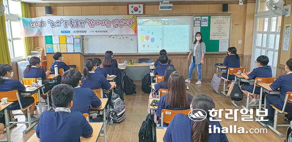 한라일보는 13일 성산중학교 1학년 학생을 대상으로 '2021 뉴스를 활용한 찾아가는 인성교육'을 실시했다. 이날 제주NIE학회 강은숙·정재은·손은영 강사는 각각 혐오 표현 없는 함께하는 사회, 가치덕목, 책임을 주제로 수업을 진행했다.