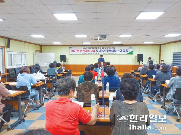 제주고산농협(조합장 고영찬)은 지난 12일 유통센터 회의실에서 여성조합원 40명이 참석한 가운데 조합원 역량 강화와 여성조직 활성화를 위한 2021년 조합원 아카데미 교육과 제6기 주부대학 신규 교육 개강식을 개최했다. 개강식 후에는 제주성공사관학교 이상숙 대표의 '행복을 디자인하라'는 웃음교실 강의도 코로나19 방역수칙을 지키며 진행했다.