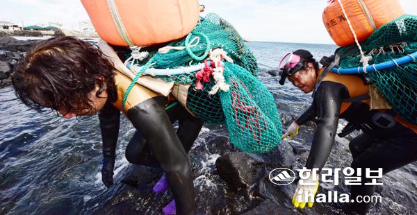 13일 제주시 한림읍 귀덕2리 바닷가에서 해녀들이 한가득 수확한 성게를 옮기고 있다. 이상국기자