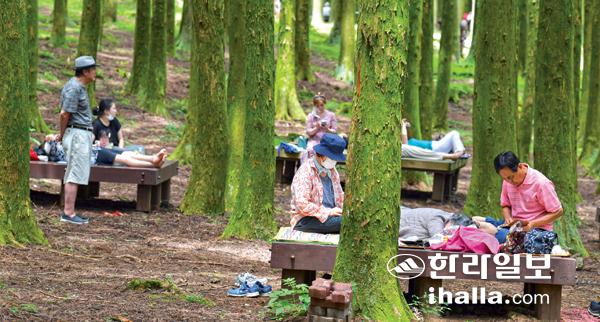 제주 전역에 폭염특보가 내려진 13일 제주시 절물자연휴양림에는 많은 도민과 관광객들이 찾아 시원한 바람을 맞으며 더위를 식히고 있다. 강희만기자