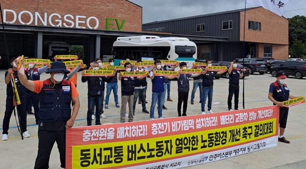 민주노총 공공운수노조 민주버스본부 제주지부 동서교통지회가 14일 서귀포시 토평동 소재 동서교통 본사에서 버스노동자들의 열악한 노동환경 개선을 촉구하고 있다.