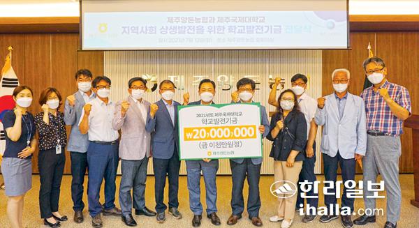 제주양돈농협(조합장 고권진)은 지난 13일 노형동 소재 본점에서 학교발전기금 2000만원을 제주국제대학교(총장 강철준)에 전달했다. 제주양돈농협은 2012년부터 매년 국제대학교에 학교발전기금과 장학금을 지원해 오고 있다.