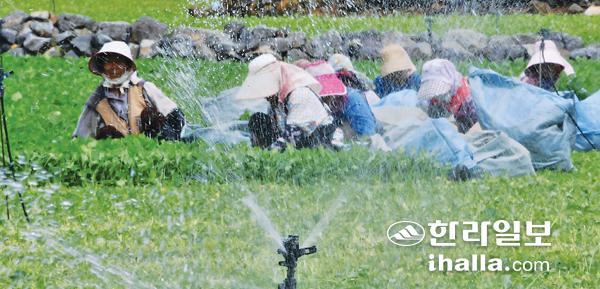 14일 제주시 애월읍 하가리 한 농경지에서 농민들이 스프링클러의 물줄기를 뒤로 하고 취나물 수확 작업에 바쁜 하루를 보내고 있다. 강희만기자